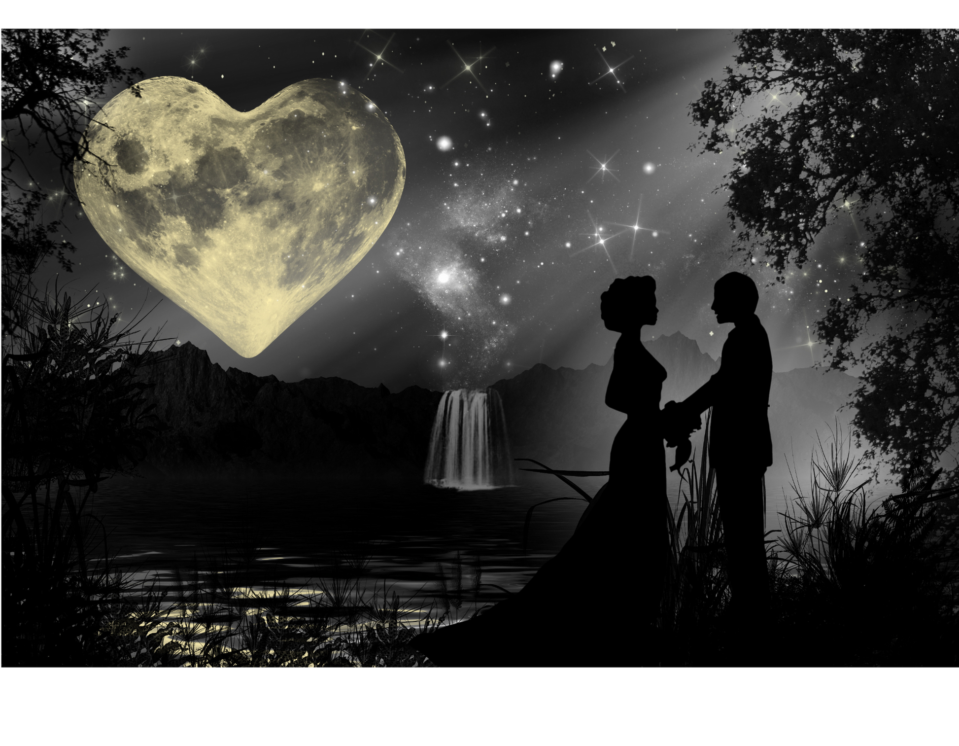 Design: Starry night, heart moon, couple silhouette in a scenic landscape