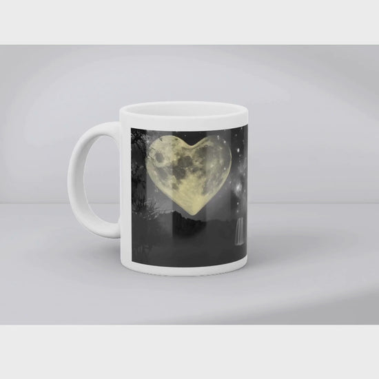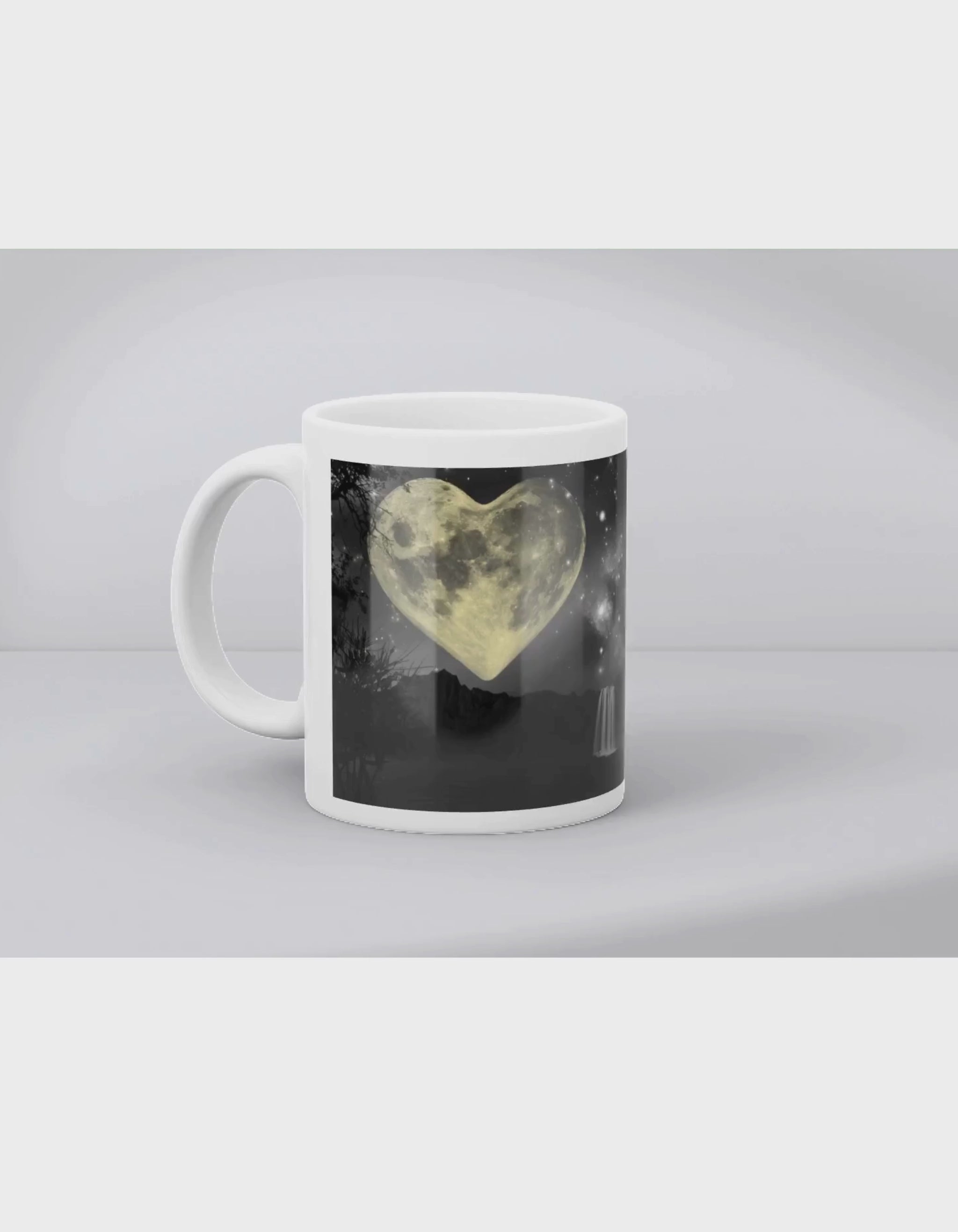 Add a dreamy touch of romance to your coffee moments with our Love Couple Night Shade Mug. Featuring a stunning moonlit scene with a heart-shaped moon, starry sky, serene waterfall, and a silhouette of a couple in love — this mug captures the magic of love under the stars.