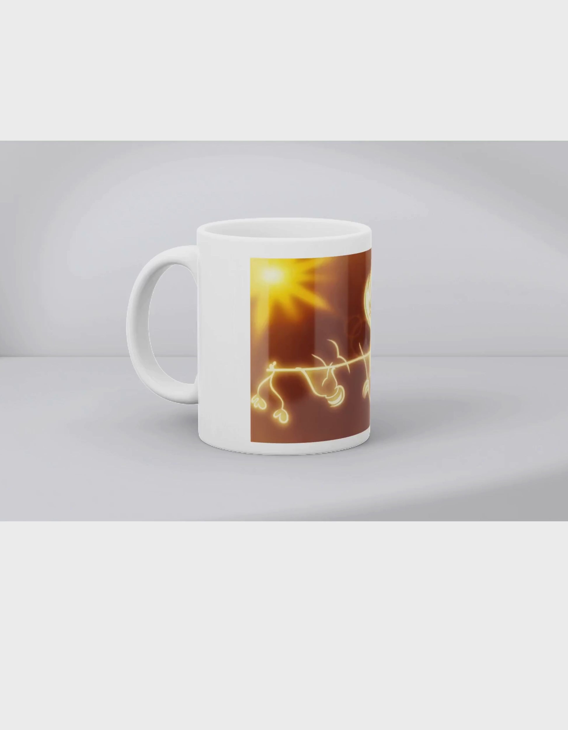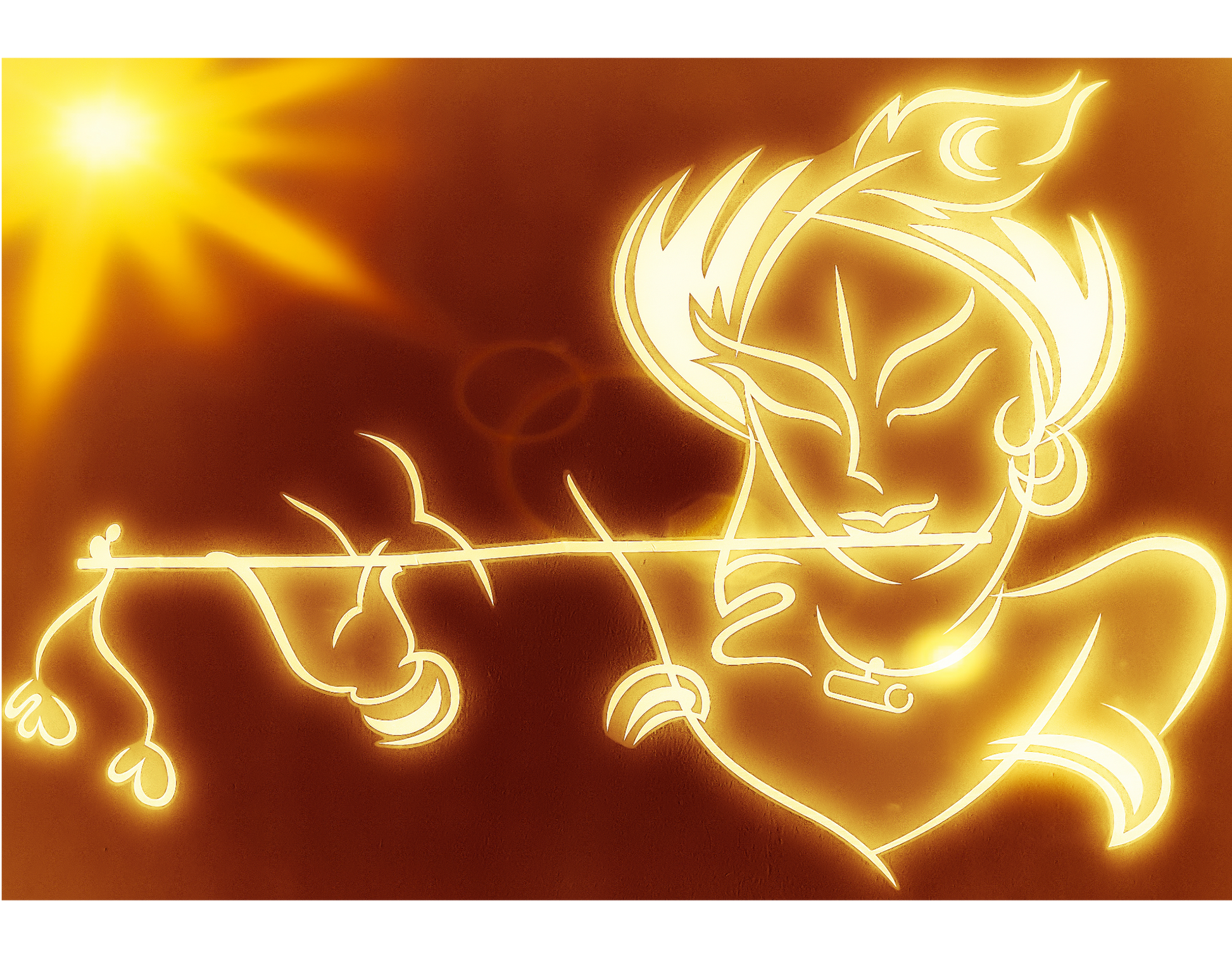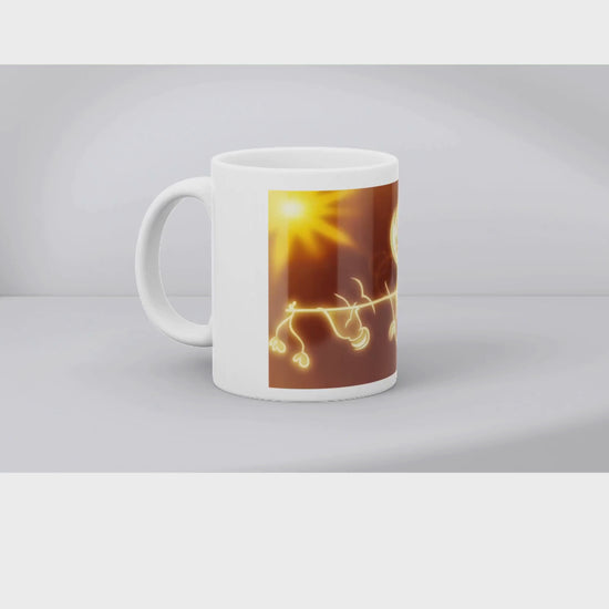A stunning mug featuring a radiant sun with golden rays illuminating Supreme god Shree Krishna playing his flute, set against a warm, earthy background. The intricate design includes his peacock feathers and hanging ornaments, offering a cultural and artistic touch. Perfect for tea or coffee enthusiasts who value unique, handcrafted-style artwork. Ideal as a thoughtful gift or a personal indulgence.