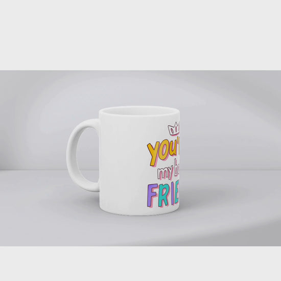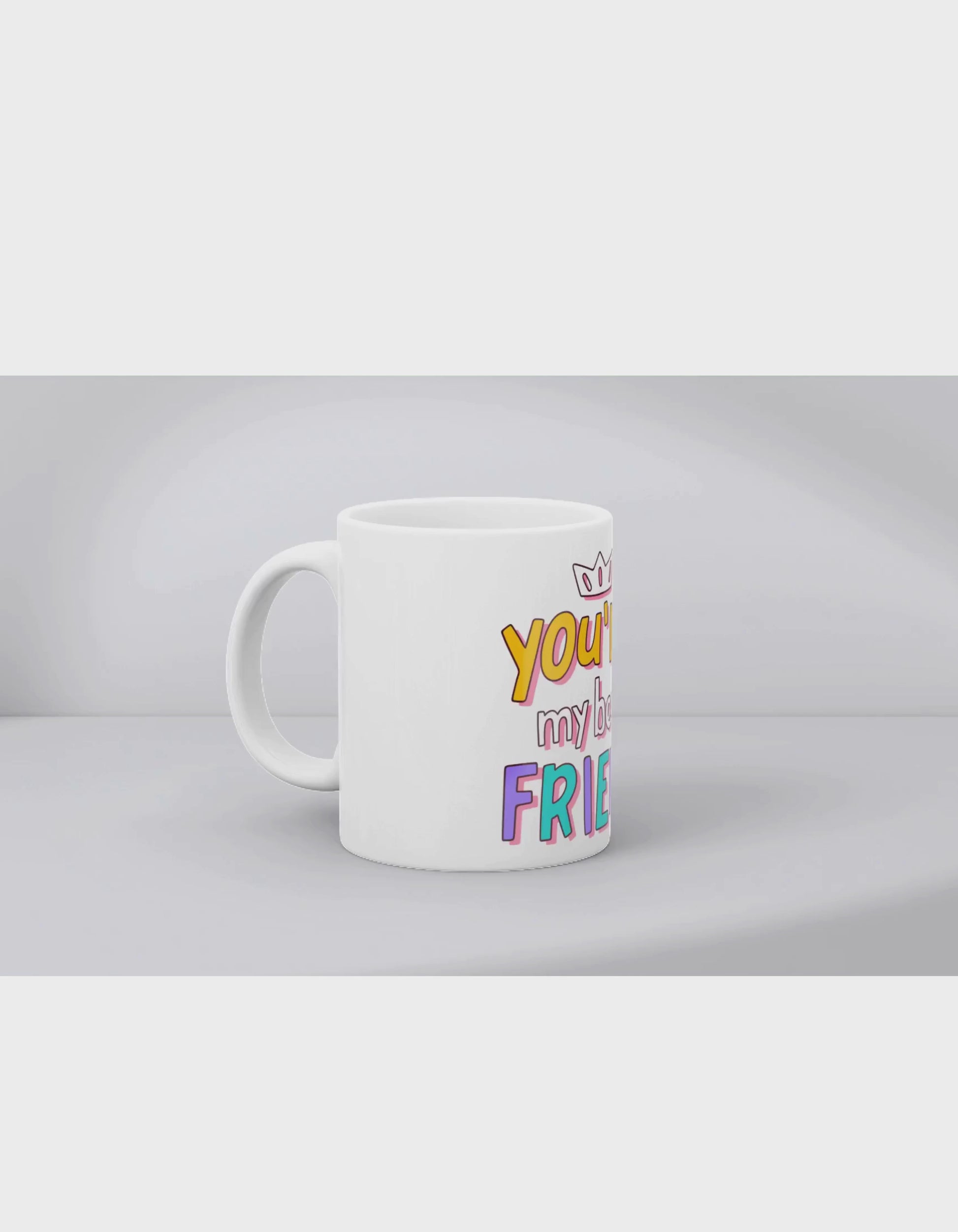Show your bestie some love with our "You're My Best Friend" Mug! This vibrant ceramic mug features a playful design with a crown and colorful text in yellow, pink, purple, and teal, making it a perfect gift for birthdays or just because. The eye-catching, hand-drawn style adds a personal touch to this charming mug.